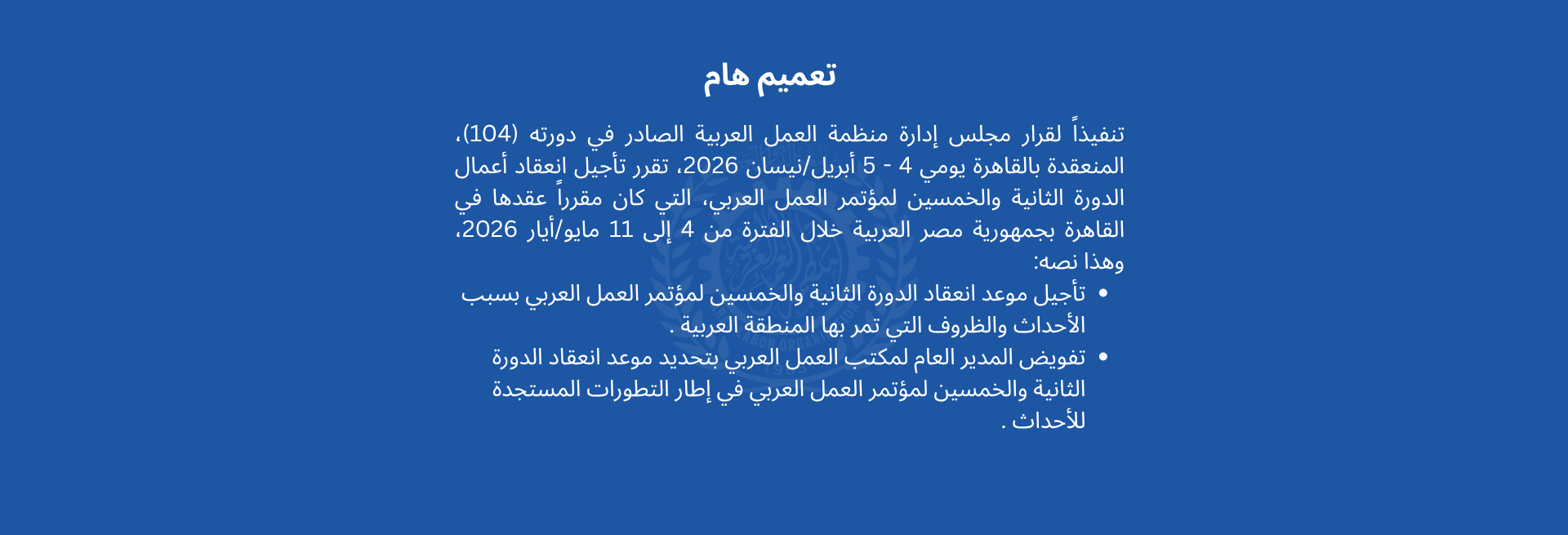 أبريل 5, 2026 المزيد "العازمي" رئيسًا للجنة الحريات النقابية في دورتها الخامسة والأربعين أبريل 5, 2026 المزيد مجلس إدارة منظمة العمل العربية يدين الاعتداءات الإيرانية المتواصلة على دول عربية مارس 26, 2026 المزيد "المطيري" يلتقي "هونجبو" على هامش الدورة (356) لمجلس إدارة منظمة العمل الدولية مارس 26, 2026 المزيد المطيري يدعو إلى اجتماع تنسيقي عربي على هامش الدورة (356) لمجلس إدارة منظمة العمل الدولية مارس 12, 2026 المزيد منظمة العمل العربية تُحذّر من تداعيات استمرار التصعيد على الاستقرار الاقتصادي والاجتماعي في الدول العربية مارس 2, 2026 المزيد منظمة العمل العربية تُدين الاعتداءات على منشآت مدنية ومناطق سكنية في دول عربية
