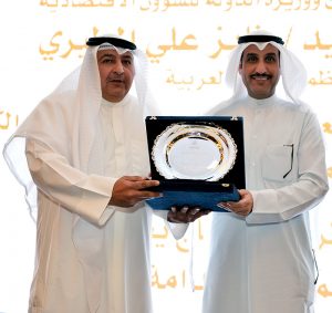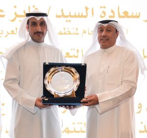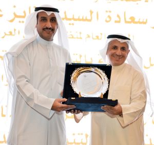 ومن جانبه قدم السيد/ محمد جمعان الحضينة – رئيس الاتحاد العام لعمال الكويت، درع الاتحاد الى سعاد السيد/ فايز علي المطيري.