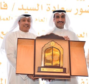 ومن جانبه قدم السيد/ محمد جمعان الحضينة – رئيس الاتحاد العام لعمال الكويت، درع الاتحاد الى سعاد السيد/ فايز علي المطيري.